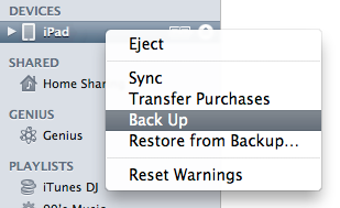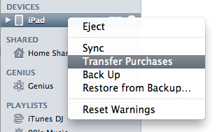 1. Right-click (or press control-click) on the name of your iPad (iPad in this example). Select Transfer Purchases from the menu. This backs up all applications you have purchased from the App Store onto your computer. If you use iTunes to buy apps, theyre already on your computer.