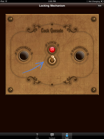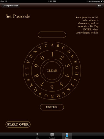 1. Passcode Set-up. The first thing you'll need to do is set your passcode. You can navigate there through the Lock Console, which is accessible from the lock icon in the toolbar at the bottom of the help screen. Or open the tool set from the main view and tap on the key icon.